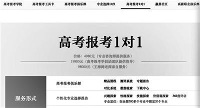 北青報(bào)記者發(fā)現(xiàn),面對(duì)考生家長(zhǎng)對(duì)于志愿填報(bào)的“迫切需求”,目前高考志愿填報(bào)咨詢的價(jià)格都在幾千元到幾萬(wàn)元不等。這位潘姓工作人員表示,該機(jī)構(gòu)設(shè)有線上、線下志愿填報(bào)兩套方案,其中線上填報(bào)方案價(jià)格為3980元,志愿填報(bào)咨詢老師與學(xué)生并不見面,而是通過(guò)QQ、郵件等方式為學(xué)生和家長(zhǎng)出具志愿填報(bào)方案。而線下志愿填報(bào)方案為1對(duì)1有針對(duì)性的填報(bào),但是根據(jù)咨詢經(jīng)驗(yàn)的多寡收費(fèi)也不相同。“比如我們有七八年行業(yè)經(jīng)驗(yàn)的呂老師收費(fèi)是22800元,有6年經(jīng)驗(yàn)的郭老師收費(fèi)是20800元,要是有3年經(jīng)驗(yàn)的李老師收費(fèi)則為16800元?!贝送?,一家名為融聚未來(lái)的機(jī)構(gòu)的高姓負(fù)責(zé)人也向記者介紹,該機(jī)構(gòu)高考志愿填報(bào)1對(duì)1服務(wù)的價(jià)格在8000元到2萬(wàn)元以內(nèi)。最讓人吃驚的是,一家名為贏鼎教育的高考報(bào)考機(jī)構(gòu),在官網(wǎng)上明示的高考報(bào)考1對(duì)1項(xiàng)目中明確標(biāo)價(jià),專業(yè)咨詢師提供服務(wù)的收費(fèi)4980元,高考報(bào)考學(xué)創(chuàng)始團(tuán)隊(duì)提供指導(dǎo)的收費(fèi)為19800元,王海濤老師親自服務(wù)的標(biāo)價(jià)為98000元。