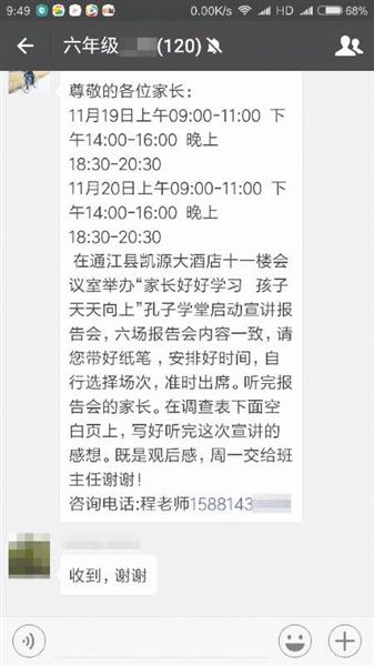 記者聯(lián)系上負(fù)責(zé)講座咨詢的程老師,他表示,此次活動(dòng)并沒有和通江縣教育科技體育局聯(lián)系,在和通江縣實(shí)驗(yàn)小學(xué)對接時(shí),確實(shí)講過要向?qū)W校捐贈(zèng)孔子文化教室,但目前還未定。在酒店舉行講座的事情沒有向通江縣實(shí)驗(yàn)小學(xué)提過。他們在學(xué)校門口組織志愿者發(fā)調(diào)查表,在通江的其他學(xué)校門口也發(fā)了調(diào)查表。對于老師在群里向家長發(fā)講座信息,程老師表示是個(gè)人行為,義務(wù)幫忙。程認(rèn)為,講座不收錢就是公益講座,推銷產(chǎn)品家長購買是家長的自愿行為。