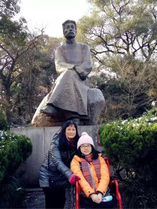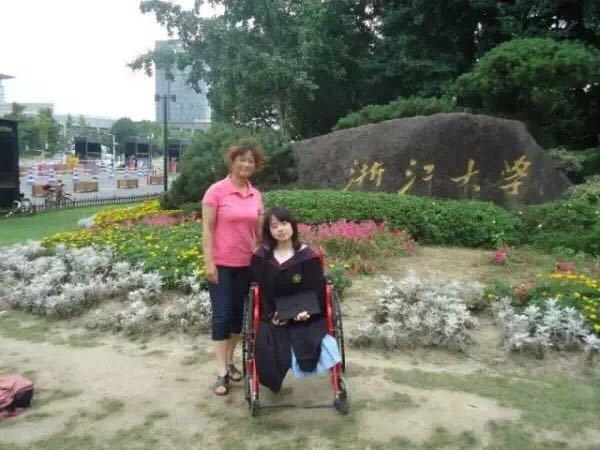 高考時(shí),葉沈俏以全省名次靠前的優(yōu)異成績(jī),被浙江大學(xué)錄取。如愿被浙大錄取后,那年初秋,葉媽媽就開始背著葉沈俏穿梭在浙大紫金港校區(qū)各個(gè)教室上課?!拔覌寢屖俏业囊粋€(gè)勇敢的榜樣,身體力行地告訴我,我可以依靠自己的努力做一個(gè)獨(dú)立有價(jià)值的人?!比~沈俏說。2010年的一次期末考試后,天空正在下雪,越來越大,別的同學(xué)早已急匆匆地考完試回家。地滑路濕,葉媽媽便穿上雨衣推著輪椅慢慢走在浙大校園里。葉沈俏說:“那一刻我覺得自己是最幸福的人,我不能放棄,而要更加努力?!眻D為葉沈俏本科畢業(yè)時(shí)與母親的合照。