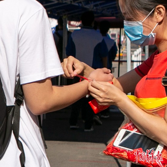 7月7日上午,北京市陳經(jīng)綸中學(xué)門口,一位老師為考生戴上代表幸運的紅手鏈。中青報·中青網(wǎng)見習(xí)記者 曲俊燕/攝