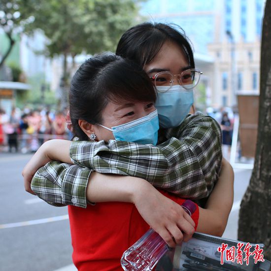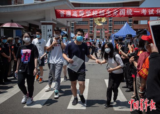 7月7日上午,北京市豐臺區(qū),北京市第十二中學(xué)考點,結(jié)束上午的考試后,高考考生們走出考場,一位考生從人群中牽起家人的手。當天是2020年全國統(tǒng)一高考第一天,據(jù)了解,今年北京市高考在7月7日至10日舉行,共49000多名考生,設(shè)17個考區(qū),132個考點學(xué)校,2867個考場,每考場考生人數(shù)由過去的30人減至20人。中青報·中青網(wǎng)記者 李崢苨/攝