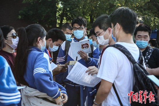 7月7日上午,北京市中國人民大學(xué)附屬中學(xué)朝陽學(xué)校(東校區(qū))門口,考生們在進入考場前抓緊時間看復(fù)習(xí)資料。中青報·中青網(wǎng)見習(xí)記者 孔斯琪/攝