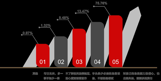廉思課題組的報(bào)告顯示,缺乏急救知識(shí)是大學(xué)生不愿參與現(xiàn)場(chǎng)急救的原因之一。當(dāng)遇到呼吸停止的無(wú)意識(shí)人員時(shí),68.33%的被調(diào)查者選擇“撥打120,并在原地等候”,能“立即上前查看,并采取急救措施”的只有25.76%。