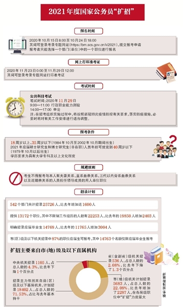 根據(jù)國家公務(wù)員局發(fā)布的國考招錄職位信息,共542個部門發(fā)布招錄計劃,涵蓋中央黨群機關(guān)、中央國家行政機關(guān)省級以下直屬機構(gòu)、中央國家行政機關(guān)(本級)和中央國家行政機關(guān)參照公務(wù)員法管理事業(yè)單位四大系統(tǒng)。 昨日,國家公務(wù)員局發(fā)布公告,今日8時起至10月24日18時,可報名中央機關(guān)及其直屬機構(gòu)2021年度考試。542個部門共計招錄25726人,比去年增加近1600人。明確招錄應(yīng)屆畢業(yè)生14769人,比去年增加3004人。 看點1 主要招錄有2年以上基層工作經(jīng)歷的人員 國家公務(wù)員局明確,中央機關(guān)及其省級直屬機構(gòu)除部分特殊職位和專業(yè)性較強的職位外,主要招錄具有2年以上基層工作經(jīng)歷的人員。市(地)級及以下直屬機構(gòu)主要招錄高校應(yīng)屆畢業(yè)生。 市(地)級及以下直屬機構(gòu)(含參照公務(wù)員法管理的單位)設(shè)置10%—15%的計劃,用于招錄服務(wù)期滿、考核合格的大學生村官、“三支一扶”計劃、“農(nóng)村義務(wù)教育階段學校教師特設(shè)崗位計劃”、“大學生志愿服務(wù)西部計劃”等服務(wù)基層項目人員和在軍隊服役5年(含)以上的高校畢業(yè)生退役士兵。 此次國考明確,地處艱苦邊遠地區(qū)的縣(區(qū))級及以下直屬機構(gòu)(含參照公務(wù)員法管理的單位),按照《關(guān)于做好艱苦邊遠地區(qū)基層公務(wù)員考試錄用工作的意見》要求,采取降低學歷要求、放寬專業(yè)條件、不限制工作年限和經(jīng)歷、單獨劃定筆試合格分數(shù)線等措施,適當降低進入門檻,推動工作力量向基層一線和艱苦邊遠地區(qū)傾斜。 報考中央機關(guān)的,曾在市(地)直屬機關(guān)工作的經(jīng)歷,也可視為基層工作經(jīng)歷。基層工作經(jīng)歷計算時間截止到2020年10月。 看點2 招錄經(jīng)濟類人才9124人在各專業(yè)中需求量最大 2021年度國家公務(wù)員考試要求考生學歷全部為大專及以上,對學歷要求更為具體,比如大專(僅限大專)、本科(僅限本科)、研究生(僅限碩士)、研究生(僅限博士),考生在報考時要看清楚,對號入座。其中要求本科學歷能報考的職位最多,所占比例最大,共有12144個職位,招錄24223人。 同時,2021年度國家公務(wù)員考試招錄條件設(shè)置中明確了各個職位的專業(yè)要求,各類專業(yè)人才都有機會參加本次考試。中公教育考試專家對職位表進行分析后介紹,經(jīng)濟類專業(yè)人才需求量最大,以招錄9124人高居榜首,金融類緊隨其后,說明2021年度國考更傾向于招錄懂經(jīng)濟的專業(yè)人才。此外,計算機類、財會類、法學類等專業(yè)的需求量也很大,招錄人數(shù)均超過六千人。 這位專家提示,大多數(shù)職位對專業(yè)要求比較嚴格,尤其是專業(yè)要求與學歷相掛鉤。考生們?nèi)绻麑ψ约旱膶I(yè)所屬門類等情況不太了解,可以致電招錄機關(guān)詳細咨詢之后再報名。 看點3 稅務(wù)系統(tǒng)招人最多加試專業(yè)科目職位數(shù)略降 本次稅務(wù)、消防系統(tǒng)、海關(guān)、鐵路公安、海事局、銀保監(jiān)會、入境邊防檢查總站、統(tǒng)計局、氣象局、水利系統(tǒng)、外交部、審計署、民用航空系統(tǒng)、長江航運公安局、證監(jiān)會等15大部門(系統(tǒng))共招錄2.4萬人,占總招錄人數(shù)的95%。 稅務(wù)系統(tǒng)招錄人數(shù)最多,接近1.5萬人,占總招錄人數(shù)的58%,在稅務(wù)系統(tǒng)中,4042個職位招錄2021年應(yīng)屆畢業(yè)生,共招錄8539人。 在2021年度國考招錄中,部分專業(yè)性較強的職位需要筆試結(jié)合工作內(nèi)容、工作性質(zhì)、工作特點進行考查。 為落實公務(wù)員隊伍專業(yè)化建設(shè)要求,加大專業(yè)能力測查力度,中國銀保監(jiān)會、中國證監(jiān)會、公安機關(guān)人民警察職位和8個非通用語職位將統(tǒng)一組織專業(yè)科目筆試,今年共有3250人、1940個職位需要加試專業(yè)科目,比去年減少386人、29個職位。 專家稱,這說明今年綜合性普通職位的數(shù)量與占比更大一些,給普通考生提供了更多機遇。 2021年度國家公務(wù)員“擴招” 報名時間 2020年10月15日8:00至10月24日18:00 其間可登錄考錄專題網(wǎng)站(https://bm.scs.gov.cn/kl2021),提交報考申請 報考者只能選擇一個部門(單位)中的一個職位進行報名 網(wǎng)上打印準考證 2020年11月23日0:00至11月29日12:00 其間可登錄考錄專題網(wǎng)站打印準考證 考試時間 公共科目考試 筆試時間:2020年11月29日 9:00—11:00 行政職業(yè)能力測驗 14:00—17:00 申論 注:在招考組織實施過程中,將按照新冠肺炎疫情防控有關(guān)要求,落實防疫措施,必要時將對有關(guān)工作安排進行適當調(diào)整。 報考條件 18周歲以上、35周歲以下(1984年10月至2002年10月期間出生) 2021年應(yīng)屆碩士研究生和博士研究生(非在職)人員年齡可放寬到40周歲以下(1979年10月以后出生) 學歷要求為具有大學專科及以上文化程度 規(guī)避原則 考生不得報考與本人有夫妻關(guān)系、直系血親關(guān)系、三代以內(nèi)旁系血親關(guān)系 以及近姻親關(guān)系的人員擔任領(lǐng)導成員的用人單位職位 招錄計劃 542個部門共計招錄25726人,比去年增加近1600人 提供13172個職位,其中不限制工作經(jīng)歷的人數(shù)有22253人,比去年的19850人增加2403人 明確招錄應(yī