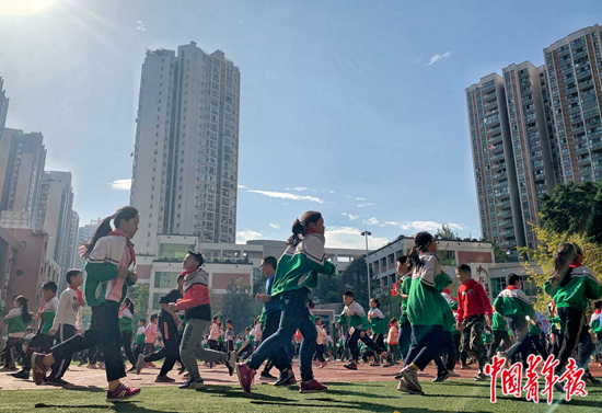 四川成都電子科技大學(xué)附屬實(shí)驗(yàn)小學(xué)的學(xué)生在進(jìn)行體育鍛煉。中青報(bào)·中青網(wǎng)記者 梁璇/攝