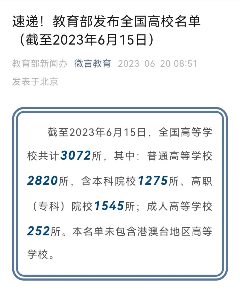 記者6月20日從教育部獲悉,根據(jù)近日發(fā)布的全國(guó)高校名單,截至2023年6月15日,全國(guó)高等學(xué)校共計(jì)3072所,其中普通高等學(xué)校2820所,含本科院校1275所、高職(專(zhuān)科)院校1545所;成人高等學(xué)校252所。