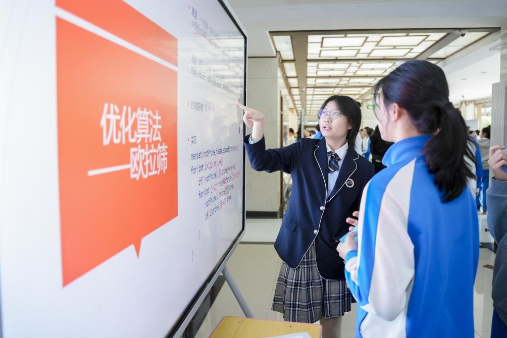 新華網(wǎng)北京3月17日電 國際數(shù)學日當天,北京市海淀區(qū)教師進修學校附屬實驗學校開展了主題為“數(shù)海揚帆智引航,數(shù)演萬物智創(chuàng)生”的數(shù)學節(jié)活動,共設置了“數(shù)海暢游”“數(shù)解科技“數(shù)論古今”“數(shù)模筑夢”“數(shù)韻流光”五大主題板塊。