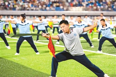 圖為8月8日,在安徽省蕪湖市繁昌區(qū)人民體育場,孫村初中學生進行太極單刀武術項目展演。肖本祥攝(人民視覺)