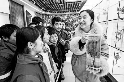 江西省撫州市資溪縣馬頭山林場野生中藥資源科普館,指導(dǎo)老師為鎮(zhèn)中心小學學生講解珍稀藥材香榧的功效與作用。 吳志貴攝/光明圖片