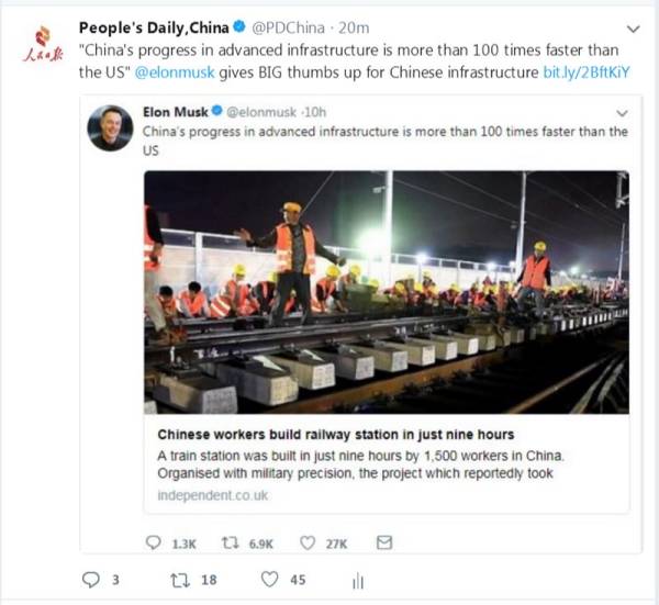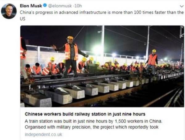 央廣網(wǎng)北京2月28日消息 近年來(lái),中國(guó)速度日益引發(fā)外媒關(guān)注。今天(28日),一段中國(guó)工人在火車(chē)站施工的視頻又走紅美國(guó),剛剛將跑車(chē)送上太空的企業(yè)家馬斯克(Elon Musk)也忍不住轉(zhuǎn)發(fā)贊嘆,“中國(guó)先進(jìn)基礎(chǔ)設(shè)施發(fā)展速度比美國(guó)快了100多倍”。