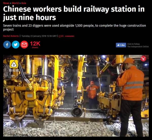 報(bào)道以《中國(guó)工人建火車(chē)站只要9個(gè)小時(shí)》為標(biāo)題,并稱(chēng)中國(guó)的先進(jìn)基建工程讓人“嘆為觀止”。