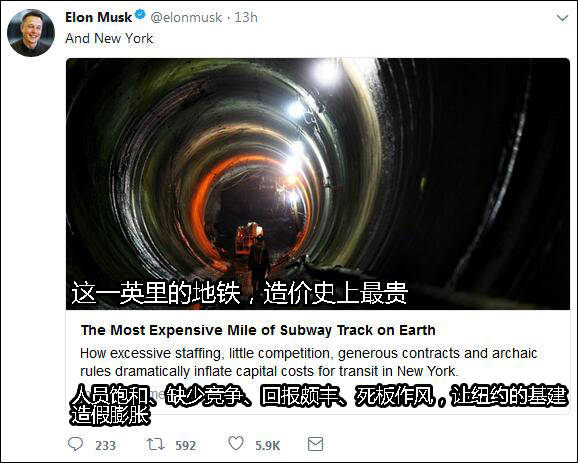 馬斯克不僅發(fā)火箭、造汽車(chē),他旗下的Boring公司,正著手通過(guò)“鼴鼠計(jì)劃”(鋪設(shè)地下高速公路),試圖改善美國(guó)這兩個(gè)地方的交通。彭博社曾表示,馬斯克也算是深知美國(guó)基建行業(yè)的業(yè)內(nèi)人士。