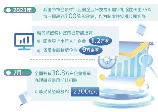 “為切實(shí)保證這一新的惠企政策落實(shí)到位,稅務(wù)部門依托稅收大數(shù)據(jù)篩選符合條件的企業(yè),定向開展政策精準(zhǔn)推送和宣傳輔導(dǎo),確保企業(yè)‘知曉政策’;會同科技部門及時發(fā)布《研發(fā)費(fèi)用加計(jì)扣除政策執(zhí)行指引2.0》,細(xì)化政策口徑,確保企業(yè)‘會用政策’;第一時間優(yōu)化升級征管系統(tǒng),改進(jìn)電子稅務(wù)局功能,讓納稅人‘足不出戶’即可快捷辦理,確保企業(yè)‘用好政策’?!眹叶悇?wù)總局新聞發(fā)言人、辦公廳主任黃運(yùn)介紹。從7月份政策落實(shí)情況看,全國共有30.8萬戶企業(yè)提前辦理研發(fā)費(fèi)用加計(jì)扣除,可享受減免稅額約2300億元。