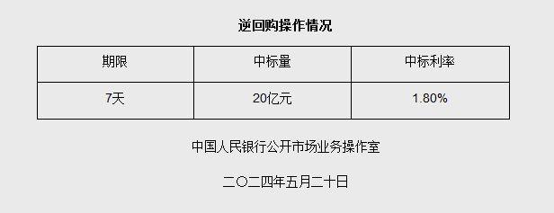 中新網(wǎng)5月20日電 據(jù)中國人民銀行網(wǎng)站消息,為維護(hù)銀行體系流動性合理充裕,2024年5月20日人民銀行以利率招標(biāo)方式開展了20億元逆回購操作。具體情況如下: