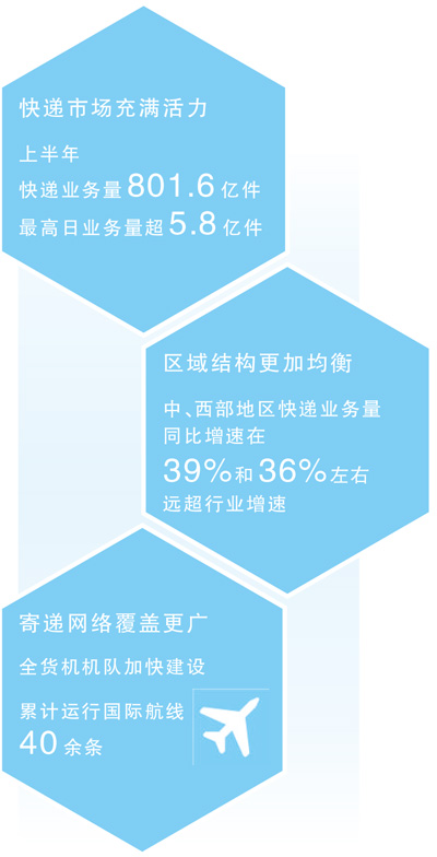 數(shù)據(jù)來源:國家郵政局 核心閱讀 作為觀察經(jīng)濟(jì)運(yùn)行的一扇窗口,上半年,中國快遞市場充滿活力、運(yùn)行良好,快遞業(yè)務(wù)量再創(chuàng)新高。“小包裹”映射活力中國,物流暢達(dá)、服務(wù)全球,一個(gè)更加完善的現(xiàn)代流通體系必將托舉起更富活力、更具韌性的中國經(jīng)濟(jì)。 801.6億件!今年上半年,中國快遞業(yè)務(wù)量再創(chuàng)新高,較去年同期增長23.1%,其中,6月快遞業(yè)務(wù)量完成145.7億件,同比增長17.7%,快遞業(yè)跑出新活力。 上半年,快遞業(yè)何以能保持快速增長?作為觀察經(jīng)濟(jì)運(yùn)行的一扇窗口,快遞業(yè)如何增強(qiáng)發(fā)展韌性,持續(xù)支撐經(jīng)濟(jì)循環(huán)?7月12日,國家郵政局舉行例行新聞發(fā)布會,介紹有關(guān)情況并回答社會關(guān)切。 發(fā)展動(dòng)力保持強(qiáng)勁,區(qū)域結(jié)構(gòu)更加均衡 “隨著我國經(jīng)濟(jì)回升向好,消費(fèi)需求保持活力,在擴(kuò)內(nèi)需、穩(wěn)增長系列政策利好下,今年以來快遞業(yè)實(shí)現(xiàn)良好發(fā)展,為服務(wù)線上經(jīng)濟(jì)發(fā)展、促進(jìn)產(chǎn)品要素流動(dòng)提供了有力支撐。”國家郵政局發(fā)展研究中心產(chǎn)業(yè)經(jīng)濟(jì)研究部主任王岳含說。 經(jīng)測算,6月中國快遞發(fā)展指數(shù)為433.7,同比提升18.4%。從分項(xiàng)指標(biāo)看,快遞發(fā)展規(guī)模指數(shù)為519.3,同比提升17.5%,寄遞需求動(dòng)力強(qiáng)勁,行業(yè)規(guī)模快速擴(kuò)增;快遞發(fā)展能力指數(shù)為229,同比增長1.7%,行業(yè)勞動(dòng)生產(chǎn)率與網(wǎng)點(diǎn)密度穩(wěn)步提升。 “6月行業(yè)運(yùn)行趨穩(wěn)是今年快遞業(yè)向好態(tài)勢的延續(xù)?!蓖踉篮f,上半年,快遞業(yè)務(wù)量超800億件,帶動(dòng)快遞業(yè)務(wù)收入達(dá)到6530億元,同比增長15.1%。 看發(fā)展動(dòng)力,上半年,快遞市場充滿活力、運(yùn)行良好,最高日業(yè)務(wù)量超5.8億件。 分時(shí)段來看,1至2月,年貨消費(fèi)需求旺盛,在快遞業(yè)支撐下,實(shí)物商品網(wǎng)上零售額超1.8萬億元,同比增長14.4%。3至4月,深挖時(shí)令、特色產(chǎn)品寄遞需求,市場規(guī)模穩(wěn)步擴(kuò)張,單月快遞業(yè)務(wù)增量保持在23億件以上。5至6月,在年中促銷、假日經(jīng)濟(jì)、生鮮季、畢業(yè)季的多重因素影響下,日均快遞業(yè)務(wù)量上升至4.8億件。 看區(qū)域結(jié)構(gòu),上半年,快遞布局更加均衡、活力涌動(dòng),區(qū)域發(fā)展協(xié)調(diào)性有所增強(qiáng)。 上半年,中、西部地區(qū)快遞業(yè)務(wù)量同比增速分別在39%和36%左右,遠(yuǎn)超行業(yè)增速,在全國的占比分別提升1.3個(gè)百分點(diǎn)和0.9個(gè)百分點(diǎn),區(qū)域發(fā)展協(xié)調(diào)性有所增強(qiáng)。其中,甘肅、內(nèi)蒙古、陜西、廣西等多個(gè)省份快遞業(yè)務(wù)量同比增速均超40%,有力帶動(dòng)區(qū)域規(guī)模穩(wěn)步擴(kuò)增。 此外,重點(diǎn)城市群加快發(fā)展。上半年,珠三角、京津冀、長江中游和成渝等重點(diǎn)城市群持續(xù)發(fā)力,快遞業(yè)務(wù)量在全國占比均有所提升。其中長江中游城市群和成渝城市群發(fā)揮鄂州花湖國際機(jī)場和成都天府國際機(jī)場等航空貨運(yùn)樞紐優(yōu)勢,帶動(dòng)多個(gè)城市業(yè)務(wù)量同比增速超40%。 農(nóng)村寄遞網(wǎng)絡(luò)覆蓋更廣,國際寄遞業(yè)務(wù)穩(wěn)步增長 “上半年,快遞業(yè)不斷加強(qiáng)農(nóng)村物流體系建設(shè),持續(xù)提升寄遞服務(wù)質(zhì)量,有力助推農(nóng)產(chǎn)品出村進(jìn)城,助力鄉(xiāng)村全面振興作用更強(qiáng)?!蓖踉篮f。 一方面,農(nóng)村寄遞網(wǎng)絡(luò)覆蓋更廣。 新疆輪臺縣輪臺鎮(zhèn),一早采摘裝箱的小白杏,下午運(yùn)到機(jī)場,轉(zhuǎn)天便上了北京消費(fèi)者的餐桌……眼下正值輪臺白杏集中上市期,借助中通快遞推出的“中通飛快”寄遞服務(wù),北上廣等城市最快次日達(dá)。截至今年6月,中通快遞網(wǎng)絡(luò)覆蓋全國行政村數(shù)量超過17.6萬個(gè),同比增長11.1%。 王岳含介紹,以加強(qiáng)“多站合一、一點(diǎn)多能”的村級寄遞物流綜合服務(wù)站建設(shè)為著力點(diǎn),上半年,快遞企業(yè)積極推動(dòng)網(wǎng)絡(luò)下沉,推動(dòng)與便利店、電商服務(wù)點(diǎn)等網(wǎng)點(diǎn)共建共用,依托村委會、黨群服務(wù)中心等場所兜底代辦快遞業(yè)務(wù),農(nóng)村寄遞網(wǎng)絡(luò)覆蓋范圍有所提升。 另一方面,農(nóng)村寄遞服務(wù)質(zhì)量更優(yōu)。 今年以來,菜鳥速遞將“生鮮平價(jià)寄”服務(wù)覆蓋春茶、楊梅、荔枝等多個(gè)生鮮主產(chǎn)區(qū),既讓消費(fèi)者嘗鮮,還讓果農(nóng)得實(shí)惠。 優(yōu)化“產(chǎn)地倉+銷地倉”物流模式,綜合運(yùn)用無人機(jī)、冷鏈車、高鐵恒溫車廂等運(yùn)輸資源,增設(shè)生鮮平價(jià)寄、鮮花選日達(dá)等多種服務(wù)……今年上半年,快遞業(yè)推進(jìn)客貨郵融合發(fā)展,豐富村級站點(diǎn)服務(wù)功能,提升進(jìn)村服務(wù)頻次與深度,農(nóng)產(chǎn)品寄遞服務(wù)品質(zhì)得到有效提升。 “快遞進(jìn)村”走向深入,“快遞出?!辈椒ヌ崴??!吧习肽?,行業(yè)持續(xù)加強(qiáng)國際寄遞物流體系建設(shè),促進
