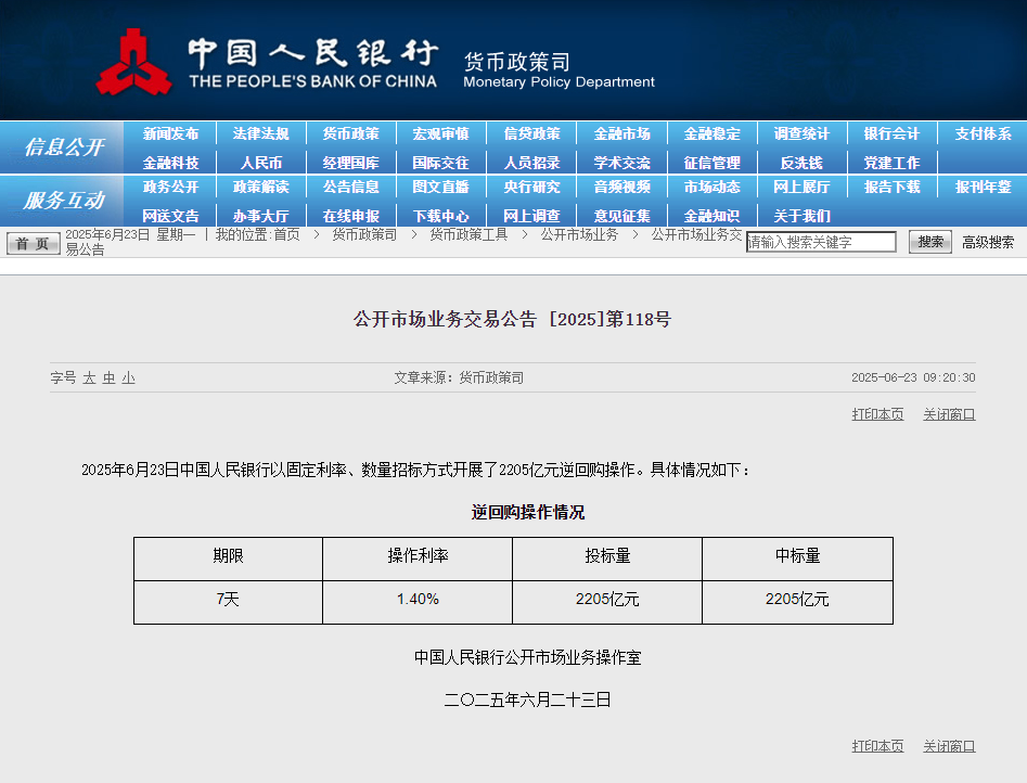 人民網(wǎng)北京6月23日電 (記者羅知之)據(jù)中國(guó)人民銀行網(wǎng)站消息,2025年6月23日中國(guó)人民銀行以固定利率、數(shù)量招標(biāo)方式開(kāi)展了2205億元逆回購(gòu)操作,操作利率1.4%。
