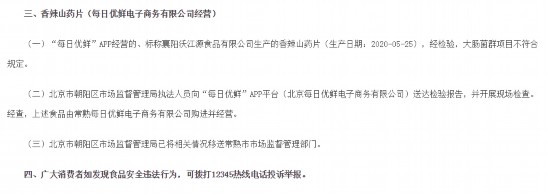 中新經(jīng)緯客戶端9月26日電 日前,北京市市場監(jiān)督管理局發(fā)布《關(guān)于不合格食品風(fēng)險控制情況的通告(2020年第18期)》顯示,“每日優(yōu)鮮”APP經(jīng)營的、標稱襄陽沃江源食品有限公司生產(chǎn)的香辣山藥片(生產(chǎn)日期:2020-05-25),經(jīng)檢驗,大腸菌群項目不符合規(guī)定。