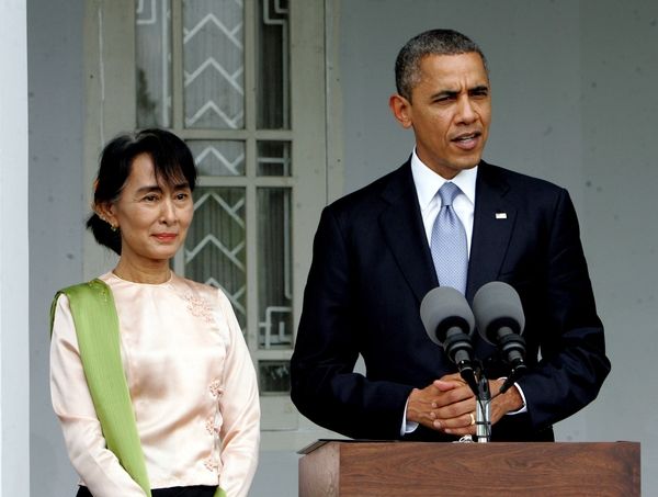 資料:2012年11月19日 ,美國總統(tǒng)奧巴馬(右)會見緬甸全國民主聯(lián)盟主席昂山素季后答記者問。