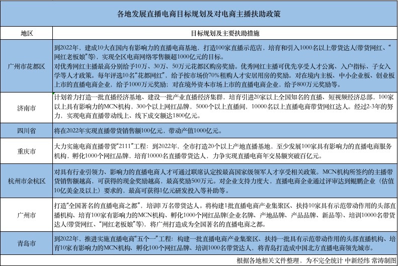 各地發(fā)展直播電商目標規(guī)劃及對電商主播扶助政策 定目標:直播電商之城爭奪戰(zhàn) 6月20日,杭州市余杭區(qū)一系列直播電商政策發(fā)布的同時,還提出要“打造直播經濟第一區(qū)”。 中新經緯記者注意到,多地在制定直播電商發(fā)展目標時,均用到了“直播電商之城”“直播電商之都”等類似表述。 例如青島市提出,到2022年,推進實施直播電商“五個一”工程,包括培訓1000名帶貨達人等,將青島打造成中國北方直播電商領先城市。廣州市提出打造“全國著名的直播電商之都”,培訓1萬名帶貨達人的口號。