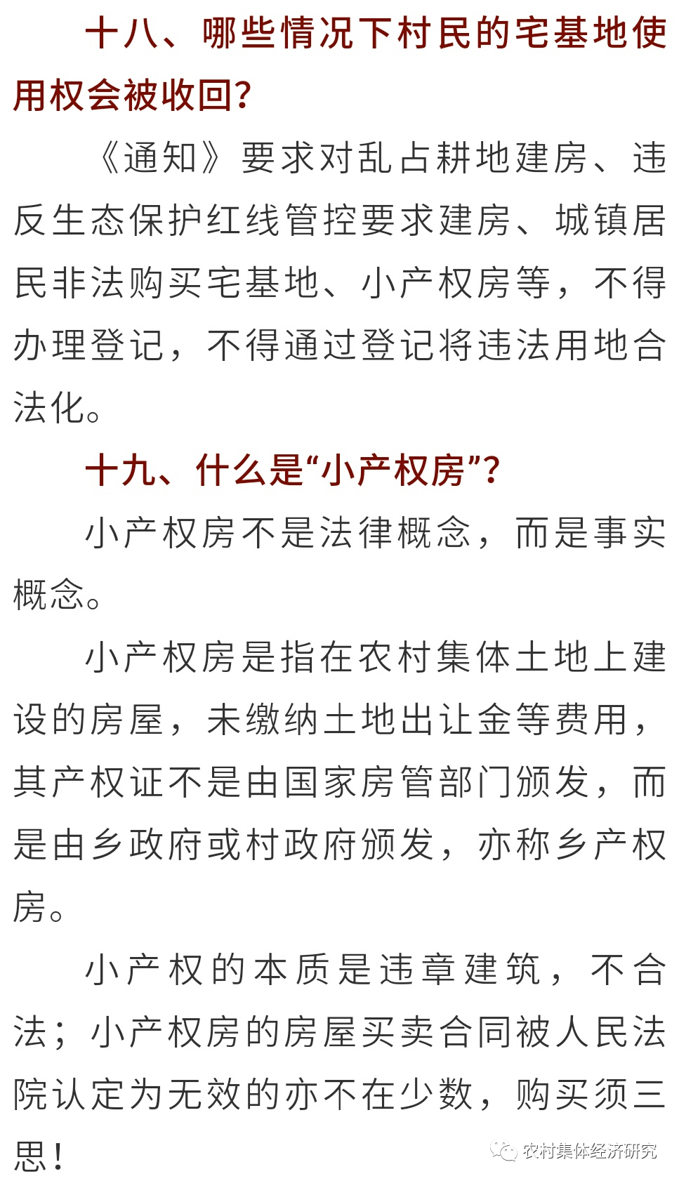二十、城鎮(zhèn)居民能否到農(nóng)村購置宅基地?不能,《通知》要求,嚴禁城鎮(zhèn)居民到農(nóng)村購買宅基地,嚴禁下鄉(xiāng)利用宅基地建設別墅大院和私人會館,嚴禁借流轉(zhuǎn)之名違法違規(guī)圈占、買賣宅基地。