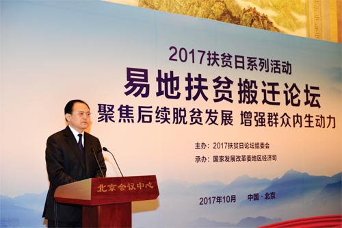 本次論壇以“聚焦后續(xù)脫貧發(fā)展,增強群眾內(nèi)生動力”為主題,是2017 年扶貧日系列活動之一。來自國家發(fā)改委、人力資源社會保障部、國土資源部、交通運輸部、水利部、農(nóng)業(yè)部、商務(wù)部、中國人民銀行、國家林業(yè)局、國家旅游局、銀監(jiān)會、國務(wù)院扶貧辦、全國工商聯(lián)、國家開發(fā)銀行、中國農(nóng)業(yè)發(fā)展銀行等部門和單位有關(guān)司局負責(zé)同志,全國22 個有易地扶貧搬遷任務(wù)的省份發(fā)展改革委負責(zé)同志以及部分省、市、縣從事易地扶貧搬遷工作的干部群眾,帶動搬遷群眾脫貧致富的部分龍頭企業(yè)代表,共約100 人參加了論壇。