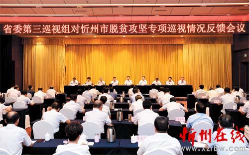 圖為省委第三巡視組對(duì)忻州市脫貧攻堅(jiān)專項(xiàng)巡視情況反饋會(huì)議會(huì)場(chǎng)。