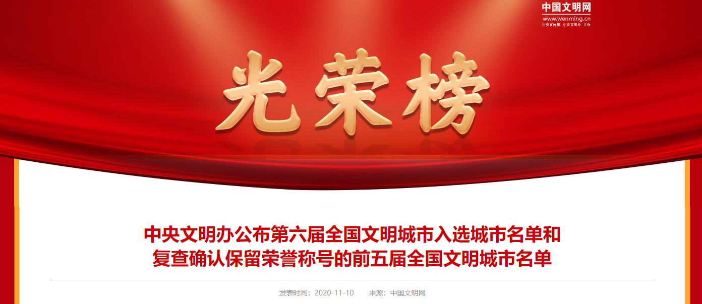 2020年8月以來,中央文明辦按照城市自主申報、省級擇優(yōu)推薦、中央部委審核、媒體集中公示、組織綜合測評、確定入選城市等評選辦法和程序,嚴(yán)謹(jǐn)規(guī)范組織第六屆全國文明城市評選工作,嚴(yán)格依據(jù)參評城市2018、2019、2020年三年測評總成績排名,提出第六屆全國文明城市入選城市名單,報中央文明委領(lǐng)導(dǎo)同志批準(zhǔn)。同時,中央文明辦按照城市自查、省級審核、中央把關(guān)、組織測評等復(fù)查辦法和程序,認(rèn)真做好前五屆全國文明城市復(fù)查工作,嚴(yán)格依據(jù)全國文明城市復(fù)查測評成績,提出繼續(xù)保留榮譽(yù)稱號的全國文明城市名單,報中央文明委領(lǐng)導(dǎo)同志批準(zhǔn)?,F(xiàn)將第六屆全國文明城市入選城市名單和復(fù)查確認(rèn)保留榮譽(yù)稱號的前五屆全國文明城市名單公布如下。