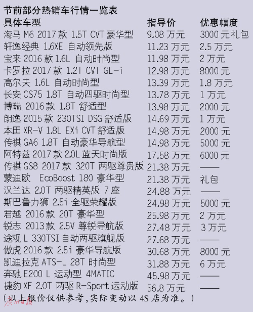 有經(jīng)銷商表示,由于今年春節(jié)來得比較早,目前大部分汽車品牌還沒有接到新一年的市場促銷政策,因此市場上還沒有出現(xiàn)大力降價促銷的情況,基本保持原有優(yōu)惠幅度。記者留意到,節(jié)前最后半個月,也有部分車型有較大的讓利幅度,但多為在廣州本地銷量較為一般的高端車或豪華車,如凱迪拉克、英菲尼迪等部分車型,優(yōu)惠基本超過6萬元以上;進口大眾途銳的優(yōu)惠高達10萬元以上;樓蘭也有高達7萬元優(yōu)惠。而熱銷車型,如卡羅拉,近期只有6000~8000元優(yōu)惠,比此前的1.2萬~1.6萬元優(yōu)惠縮水不少;朗逸近期也只有8000~1萬元讓利,比此前也縮水近一半。經(jīng)銷商建議,如果不急著節(jié)前買車,等到節(jié)后看看也不遲。