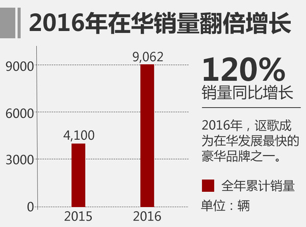 由于此前在華的產(chǎn)品投入等多方問(wèn)題,入華已經(jīng)達(dá)到10年的本田高端品牌謳歌,銷量并沒(méi)有得到顯著提升,2015年謳歌在中國(guó)市場(chǎng)的新車上牌量?jī)H為4,100輛,數(shù)據(jù)并不美麗。2016年謳歌重整旗鼓,制定完善的在華戰(zhàn)略,推出首款國(guó)產(chǎn)車型CDX后其銷量得到明顯提升,2016年累計(jì)售出9,062輛,同比大增120%,成為增速第二快的豪華品牌。