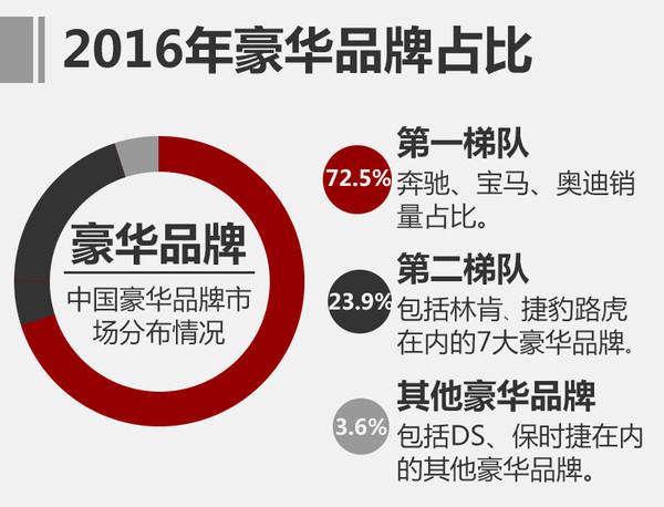 而包括捷豹路虎、凱迪拉克、雷克薩斯、沃爾沃、英菲尼迪、林肯和謳歌組成的豪華品牌第二梯隊(duì),2016年總銷量為520,354輛,占整個(gè)豪華車市場(chǎng)23.9%。注:保時(shí)捷品牌定位問(wèn)題,不算在第二梯隊(duì)內(nèi)。