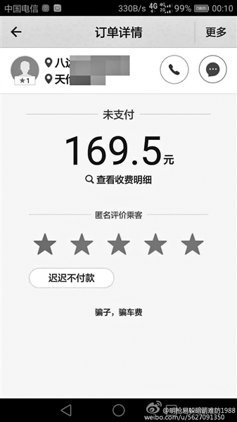 在某網(wǎng)站論壇上,一名順風(fēng)車司機爆料說,晚上下班后接了一單滴滴順風(fēng)車,想著反正順路,上班路上接一單抵個油費也是好的。送到目的地后,自己出于習(xí)慣讓乘客先下車后付款,沒想到對方是用小號注冊的滴滴賬戶,晚飯后再打電話已經(jīng)是“空號”?!斑@顯然是惡意打霸王車啊?!?/p>