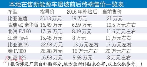 春節(jié)剛過,原計(jì)劃買輛純電動車上下班用的番禺市民劉先生,在去4S店轉(zhuǎn)了一圈后,開始猶豫了。原本看中的一款車,最終購車預(yù)算比去年年底多了好幾萬元。車商告訴他,因?yàn)椤把a(bǔ)貼退坡”,1月份還能以15.98萬元買到的一輛純電動新能源汽車,現(xiàn)在漲到20.38萬元左右。劉先生表示,補(bǔ)貼少已成定局,他決定與家人再等兩三個(gè)月,看有沒有性價(jià)比更高的新能源車可選,不然就將配置需求降低,買一輛更便宜的電動車。