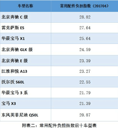 常用配件負擔(dān)指數(shù)方面,在汽車零整比系數(shù)基礎(chǔ)上,挖掘事故車維修數(shù)據(jù),選取配件損失率大于 1%的常用配件進行研究,導(dǎo)入計算公式核算各車型的常用配件負擔(dān)指數(shù)。在樣本車型中最高的車型為北京奔馳 C級,常用配件負擔(dān)指數(shù)為 28.82;最低的車型為哈弗 H6,常用配件負擔(dān)指數(shù)為 9.32。