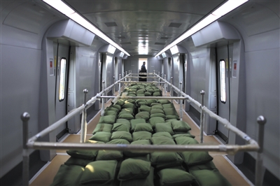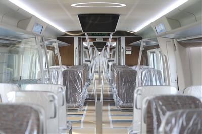 目前列車設計載客量為每平方米9人,列車最大載客量為1500人左右。為保證舒適度,車廂設計得更加寬敞明亮。車廂設計寬3.3米,普通車設置雙排座椅,商務車設置2+1座椅,為方便乘客放置隨身攜帶的行李,加寬了座椅前后的距離,普通列車座椅前后寬度1.03米,商務車廂有1.25米。