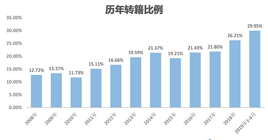4月全國二手車市場交易量為120.06萬輛,環(huán)比下降4%,同比增長4.29%;1-4月,二手車?yán)塾?jì)銷售445.63萬輛,同比增長2.61%,跨城市交易額比例達(dá)到29.95%。羅磊表示,隨著全國各區(qū)域二手車流通的壁壘逐步消除,二手車全國自由流通越來越快捷,這一利好因素促使國內(nèi)二手車交易轉(zhuǎn)籍比例在過去10年里呈逐年上升趨勢。