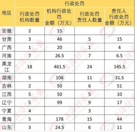 處罰機(jī)構(gòu)5個(gè)以上的地區(qū)有:黑龍江(處罰機(jī)構(gòu)18個(gè),對(duì)機(jī)構(gòu)罰款合計(jì)461.5萬元;處罰責(zé)任人24個(gè),對(duì)責(zé)任人罰款合計(jì)145.5萬元);重慶(處罰機(jī)構(gòu)10個(gè),對(duì)機(jī)構(gòu)罰款合計(jì)348萬元;處罰責(zé)任人15個(gè),對(duì)責(zé)任人罰款合計(jì)131萬元)。