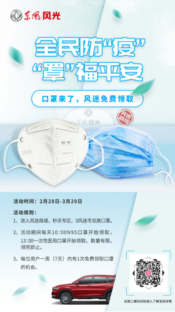 針對疫情期間“一罩難求”的問題,東風小康公司推出了“萬只口罩限量免費領(lǐng)取”活動,從現(xiàn)在至3月29日,風迷商城將每天免費送出100份N95、一次性醫(yī)用口罩,為用戶獻上專屬關(guān)愛。