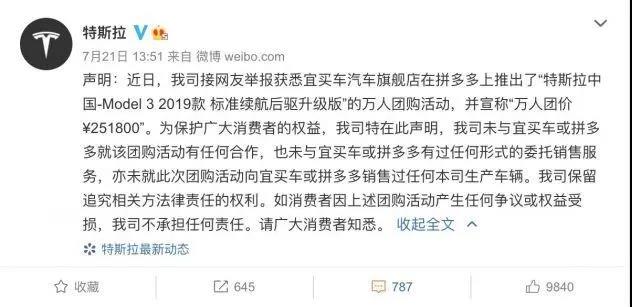 特斯拉在微博上對于拼多多“團(tuán)購”的聲明截圖。