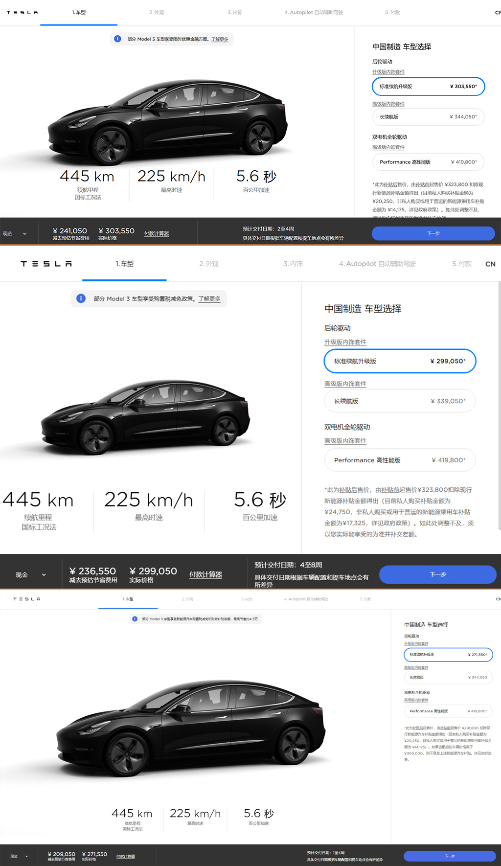 特斯拉Model 3標(biāo)準(zhǔn)續(xù)航后驅(qū)升級版價格多次調(diào)整官網(wǎng)截圖。
