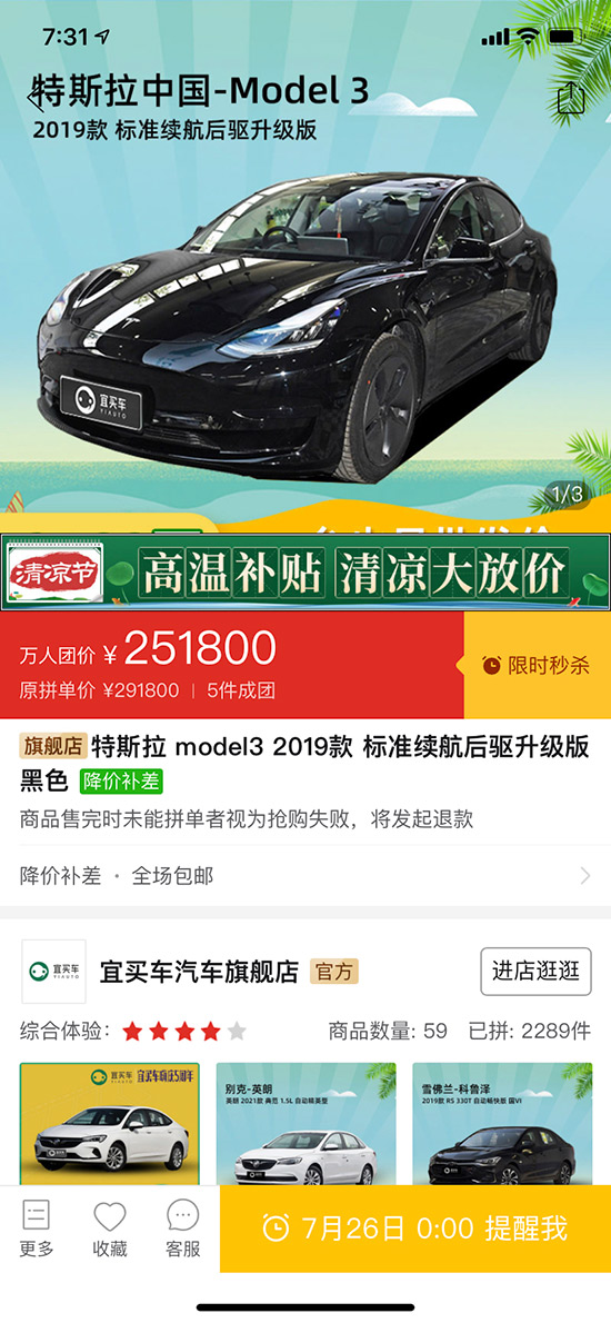 今年7月21日,連鎖汽車銷售平臺宜買車聯(lián)合拼多多推出了一場特斯拉萬人團(tuán)購活動。活動期間,特斯拉官方指導(dǎo)價為27.155萬元的特斯拉Model 3 標(biāo)準(zhǔn)續(xù)航后輪驅(qū)動升級版 ,在拼多多平臺上的團(tuán)購價為每臺25.18萬元,團(tuán)購價格比官方售價便宜了近2萬元。
