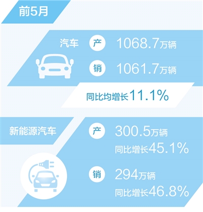 乘用車、商用車產(chǎn)銷同比均較快增長。1—5月,乘用車?yán)塾嬐瓿射N量900.1萬輛,同比增長10.7%。商用車產(chǎn)銷分別完成162.5萬輛和161.6萬輛,同比分別增長14.2%和13.7%。其中,中國品牌乘用車市場份額持續(xù)增長,前5月累計銷售478.1萬輛,同比增長22.7%,市場份額53.1%,上升5.2個百分點。