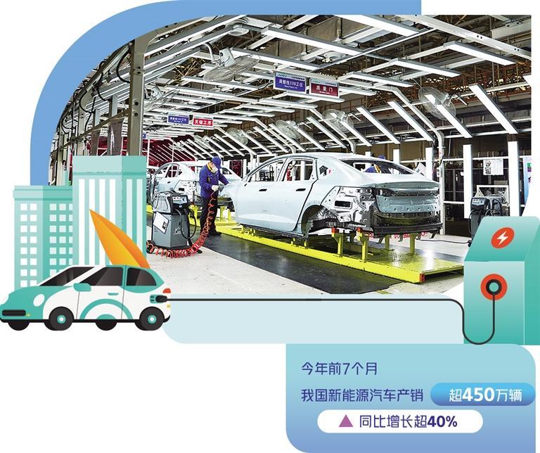 新能源汽車是全球汽車產(chǎn)業(yè)轉(zhuǎn)型升級、綠色發(fā)展的主要方向,也是我國汽車產(chǎn)業(yè)高質(zhì)量發(fā)展的戰(zhàn)略選擇。今年前7個月,我國新能源汽車產(chǎn)銷超過450萬輛,同比增長超過40%。其中,出口63.6萬輛,同比增長1.5倍,成為我國經(jīng)濟(jì)一個強(qiáng)勁增長點。