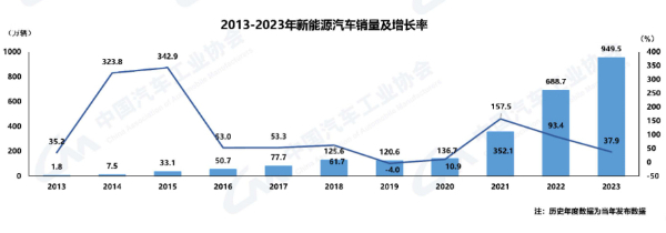 據(jù)中汽協(xié)統(tǒng)計(jì)分析,2023年我國新能源汽車產(chǎn)銷分別完成958.7萬輛和949.5萬輛,同比分別增長(zhǎng)35.8%和37.9%,市場(chǎng)占有率達(dá)31.6%。