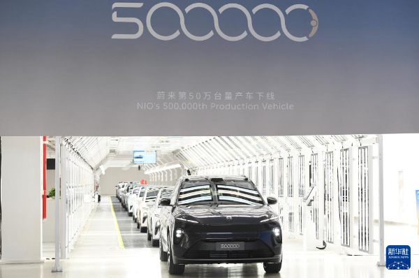5月9日,在安徽省合肥市新橋智能電動(dòng)汽車產(chǎn)業(yè)園蔚來(lái)第二工廠,蔚來(lái)第50萬(wàn)臺(tái)量產(chǎn)車下線。新華社記者張端攝