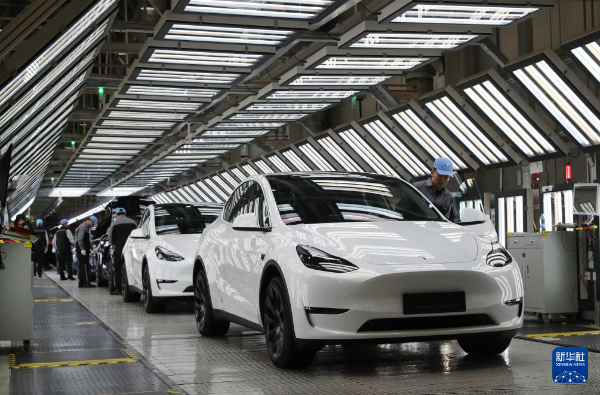 2023年12月22日,在特斯拉上海超級(jí)工廠內(nèi),工人在對(duì)出廠前的車輛進(jìn)行漆面及門(mén)窗檢測(cè)。新華社記者方喆攝
