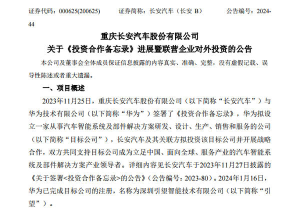 2023年11月25日,長安汽車與華為簽署《投資合作備忘錄》。華為擬設立一家從事汽車智能系統(tǒng)及部件解決方案研發(fā)、設計、生產(chǎn)、銷售和服務的公司,雙方共同支持目標公司成為立足中國、面向全球、服務產(chǎn)業(yè)的汽車智能系統(tǒng)及部件解決方案產(chǎn)業(yè)領(lǐng)導者。