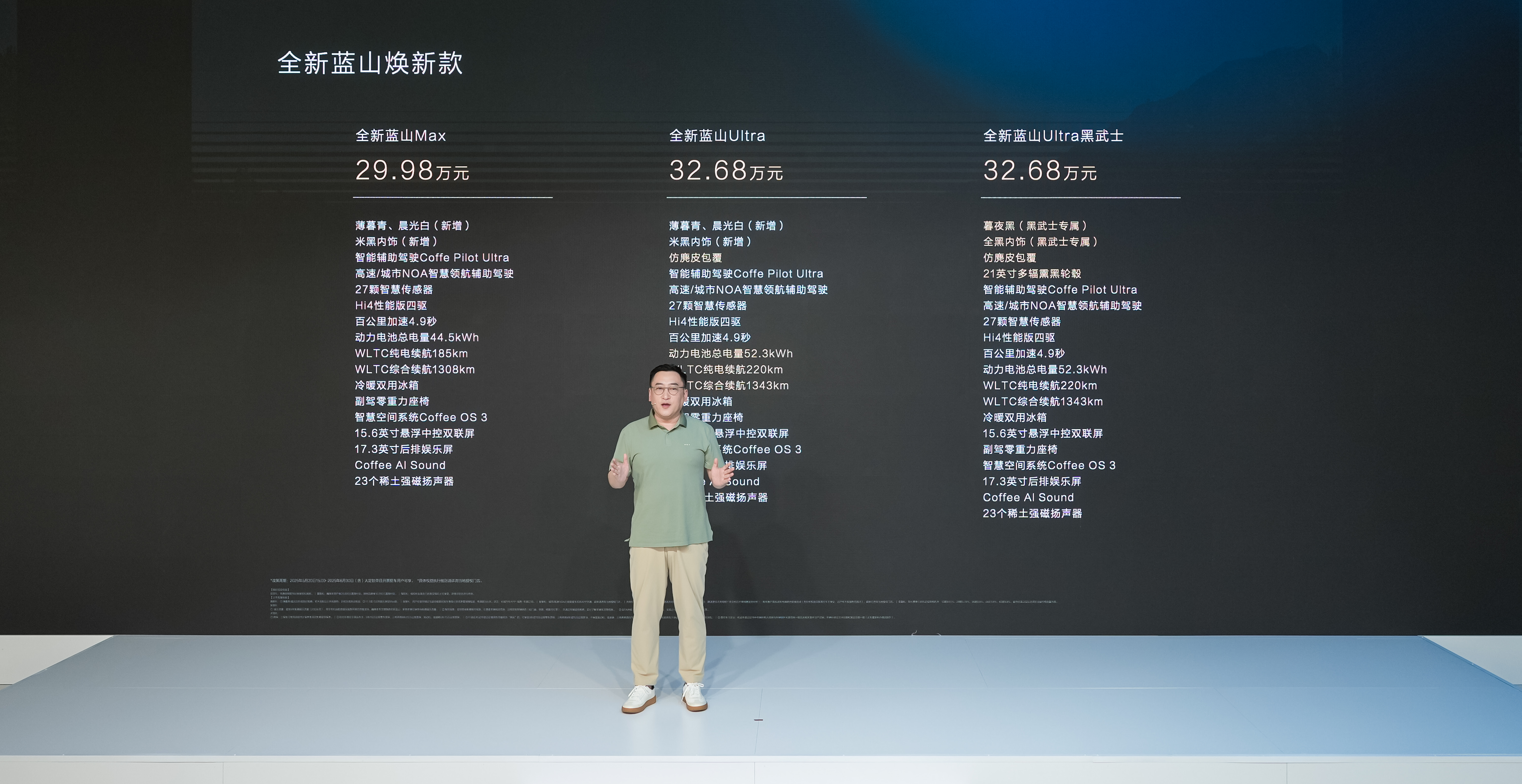 全新藍(lán)山煥新款正式發(fā)布,全新藍(lán)山煥新款MAX版、全新藍(lán)山煥新款Ultra版、全新藍(lán)山煥新款Ultra黑武士版售價分別為29.98萬元、32.68萬元、32.68萬元。購車用戶可享至高價值82,599元的限時煥新權(quán)益,魏牌老用戶置換全新藍(lán)山煥新款,可獲翻倍補貼及終身免費流量。