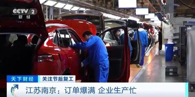在南京市江北新區(qū)的一家大型汽車生產(chǎn)企業(yè),其中一個(gè)車間面積4萬(wàn)平方米,產(chǎn)線從腳下延伸到了頭頂,工作人員正在緊張忙碌著,一輛輛嶄新的汽車高效地走向流水線。這里每天可以生產(chǎn)汽車1000輛左右。一些剛剛上市的新款新能源汽車產(chǎn)品,銷售非?;鸨?,訂單已經(jīng)排到了今年下半年。正月初五這里已經(jīng)全員在崗趕訂單。這個(gè)車間,每天兩個(gè)班組,1200多名工人日夜在崗,這個(gè)數(shù)字是去年春節(jié)同期的2.5倍。