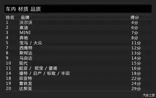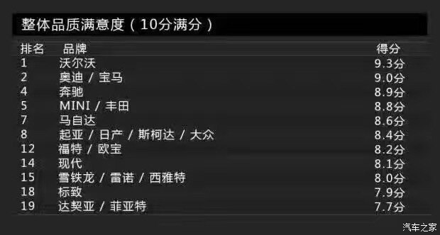 Bild調(diào)查的車身品質(zhì)(接縫)主要包括車身品質(zhì)、開(kāi)關(guān)門的手感、鋼板接縫及經(jīng)常與身體接觸的地方。沒(méi)錯(cuò),這一單項(xiàng)表現(xiàn)最佳的是沃爾沃,得分為2分。這里小編要敲黑板提醒大家注意了:在車身品質(zhì)(接縫)滿意度上,得分最低表現(xiàn)最好。當(dāng)然,斯柯達(dá)也得到了2分,寶馬、奔馳則同為3分。而得分最高的就是前面提到的達(dá)契亞,它的得分是12分,換句話說(shuō)就是達(dá)契亞是車身品質(zhì)滿意度最低的品牌。有意思的是與達(dá)契亞一起墊底是法系品牌雷諾,它的得分是11分。