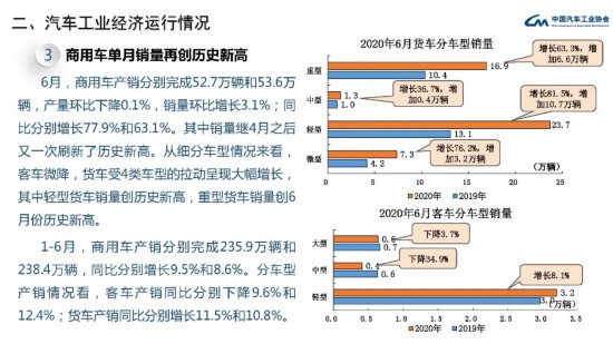 上半年,商用車產(chǎn)銷235.9萬輛和238.4萬輛,同比增長9.5%和8.6%,結(jié)束了下降趨勢。在商用車主要品種中,客車產(chǎn)銷均呈下降,貨車產(chǎn)銷呈較快增長。
